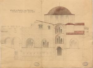 Katholikon- South elevation. This is a preliminary drawing. Further annotation in pencil survives.