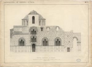 Katholikon - South elevation. Noteworthy is the dental frieze that surrounds the grouped-type windows. The drawing is entitled: 'Monastery of Daphni Attica'. Further annotation in ink survives.