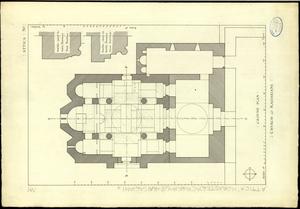 Ground plan. This is a ground plan of the cemeterial chapel, a three-aisled domed basilica dedicated to Hagios Nikolaos, which is located to the east of the monastic complex. A crypt with eight graves has been excavated below the church. The walling of the building is of typical cloisonné. The chapel is dated to the late 11th c. Further annotation in pencil survives.