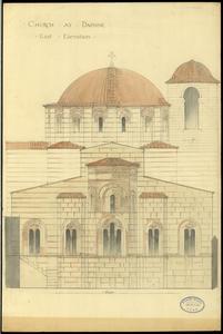 Katholikon - East elevation. Noteworthy is the meander frieze in the central apse. The drawing is entitled: 'Church at Daphne', 'East Elevation'. Further annotation in ink survives.