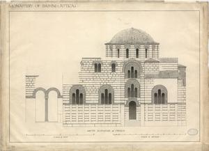 Katholikon - South elevation. Noteworthy is the dental frieze that surrounds the grouped-type windows. The drawing is entitled: 'Monastery of Daphni Attica'. Further annotation in ink survives.