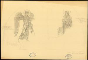 Katholikon - Mosaic decoration. The Drawing depicts three of the images of the Prophets which decorate the dome. This is a preliminary drawing. A unfinished sketch depicting a priest inside a holy bema survives in pencil at the back.