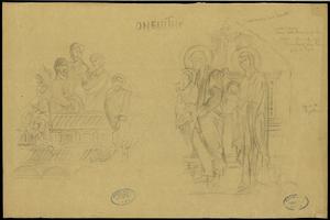 Katholikon, narthex - Mosaic decoration. The drawing depicts parts of two of the scenes which decorate the narthex: of the Washing of the Feet and the Presentation of the Virgin. This is a preliminary drawing. Further annotation in pencil survives.