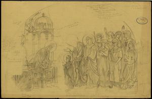Katholikon, narthex - Mosaic decoration. The drawing depicts the scene of the Presentaton of the Virgin which decorates the east wall of the narthex. This is a preliminary drawing. Further annotation in pencil survives.