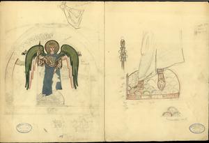 Katholikon, bema - Mosaic. The drawing depicts the image of Archangel Michael which decorates the north conch of the bema. This is a preliminary drawing. Further annotation in pencil survives.