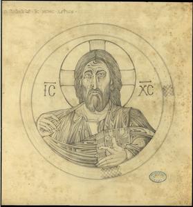 Katholikon, Nave (dome) - Mosaic decoration. The drawing depicts the image of the Pantokrator, one of the most celebrated images of Byzantine art, which occupies the centre of the large dome. Recent cleaning by the Greek Archaeological Service revealed the plasticity in the rendering of this austere face. This is a preliminary drawing. It is entitled (in Greek):
