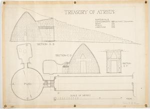 It is a final ink drawing of the plan and section of the Treasury of Atreus. It has a legend identifying the materials used in construction and a scale for reference. A preliminary version of section C-D is represented in MYC 2/2/1 and a preliminary version of section E-F is represented in MYC 2/2/2.