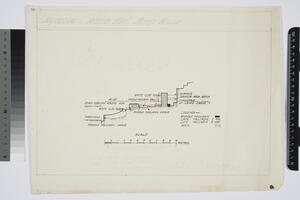 It is a final drawing of the section the Ramp House with the constituent parts labeled. There is a scale for reference, a legend which identifies the periods of construction, and minor annotations.