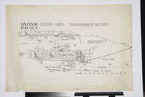 It is a final drawing of the plans and section of the Palace at Mycenae’s Grand Staircase. There are basic labels indicating the direction of the stairs and identifying certain sections, as well as a scale for reference.