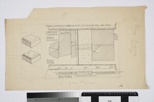 It is a final drawing of two sections below the floor between the big blocks of the Dromos in the Treasury of Atreus. The constituent parts are labeled and there are some annotations.