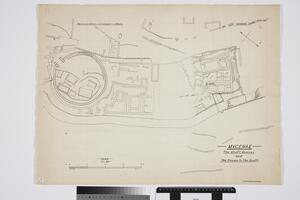 It is a final drawing of the plan of the shaft graves and the houses to the south. None of the sites are labeled, but there is a scale for reference. There is a light sketch of a building plan on the back
