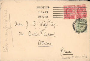 Letter from Mashenka? to Cassius? (On The Victoria, University of Manchester letterhead) regarding the analysis of sherds. With envelope addressed to Alan J.B. Wace, British School at Athens