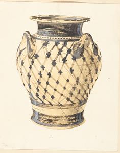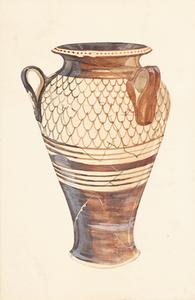 Watercolour drawing of L.H. II Three Handled Amphorae No. 3 from Tomb 529 decorated with a network pattern. MYC 3/1/37/1 - MYC 3/1/37/7 are all included in 1936 Exhibition collection: 1936 EXH - 110.