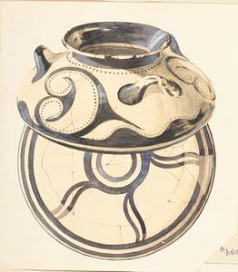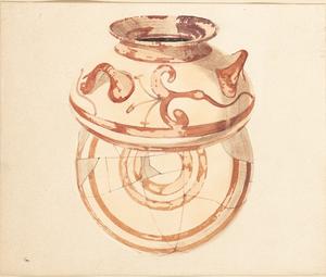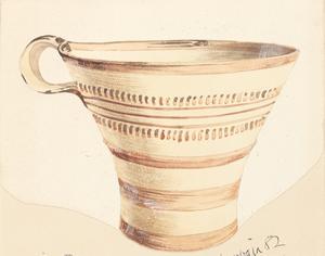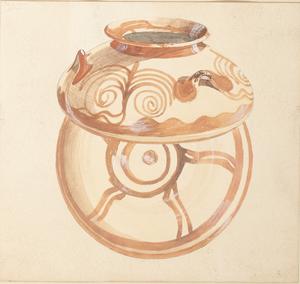 Watercolour drawing of cup decorated with spiral designs from below the floor of the east lobby of the Grand Staircase. MYC 3/1/34/1 - MYC 3/1/34/4 are all included in 1936 Exhibition collection: 1936 EXH - 107
