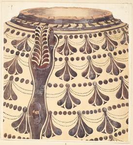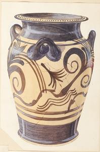 Watercolour drawing showing detailed reproduction of the pattern on a palace style amphorae from the tomb of Aegisthus. MYC 3/1/37/1 - MYC 3/1/37/7 are all included in 1936 Exhibition collection: 1936 EXH - 110.