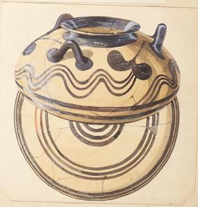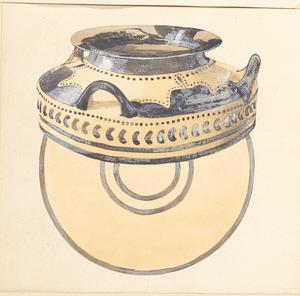 Watercolour drawing of Vaphio cup decorated with spiral designs from below the floor of the east lobby of the Grand Staircase. MYC 3/1/34/1 - MYC 3/1/34/4 are all included in 1936 Exhibition collection: 1936 EXH - 107