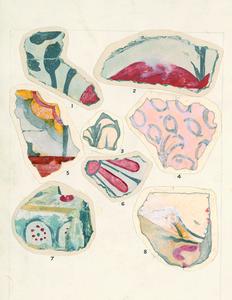 Watercolour drawing of fresco fragments with various plant designs (rosettes, petals, leaves, and stems) from the Palace. The individual fragments are numbered (1-8). The fragments were found in the following locations: 1, 2, from east lobby; 3-5, pithos area; 6, guardroom; 7, porch; 8, megaron. Fragment #1 is also included as MYC 3/2/18.