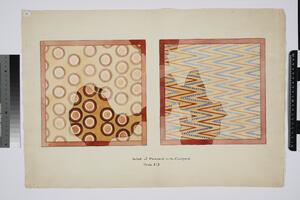 Watercolour drawing of a painted stucco floor, from the dado of the Palace's Porch, with multiple half rosette patterns. It is labelled “90(a)” on the front and “164” on the back.