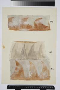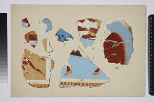 Watercolour drawing of fresco fragments displaying women, specifically their dresses, from the Ramp House. The individual fragments are numbered (8-10, 23-25). This is the final version from which MYC 4/01 & MYC 4/06 were printed. Individual fragments are also included as MYC 3/2/03 & MYC 3/2/04.