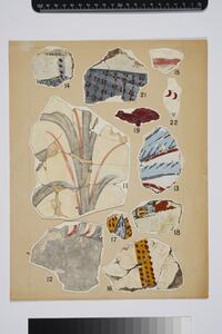Watercolour drawing of fresco fragments displaying plants with blue leaves from the Ramp House. The individual fragments are numbered (11-19, 21-22). This is the final water-colour from which MYC 4/02 & MYC 4/07 were printed. Fragment #13 is included in MYC 3/2/05.