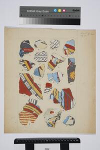 Watercolour drawing of pottery fragments from cups with varying designs from below the floor of the east lobby of the Grand Staircase. MYC 3/1/34/1 - MYC 3/1/34/4 are all included in 1936 Exhibition collection: 1936 EXH - 107