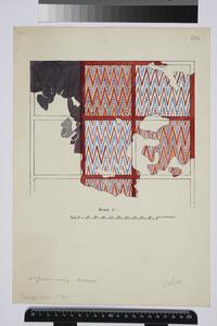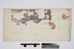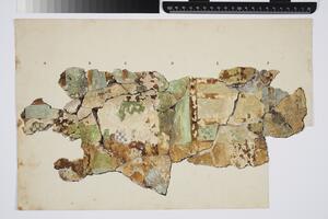 Watercolour drawing showing squares 1a & 2b of the North side floor of the palace. The surviving fragments are identifiable by their much brighter colors. These squares are also represented in MYC 3/2/12, MYC 3/2/25, & MYC 3/2/26
