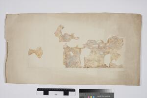 Watercolour drawing of fresco fragments (numbered a-p), found by Tsountas in 1886, showing various body parts, jewellry, and clothes. The fragments were probably from a fresco of women in procession.
