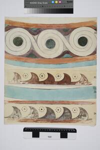 Watercolour drawing of a fragment from the Tomb of Aegisthus with fish scale pattern. MYC 3/1/35/1 - MYC 3/1/35/9 are all included in 1936 Exhibition collection: 1936 EXH - 108