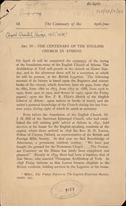 Offprint from Church Quarterly Review, 126 (1938), 68-82, presented by the author, William Miller; Article IV, 'The Centenary of the English Church in Athens'..