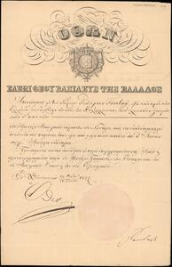 Notice of award of Silver Cross for military service during the War of Revolution (Athens 14/26 February 1836) (in Greek).