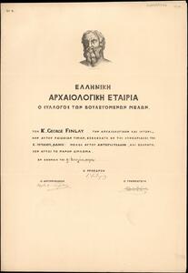 (in envelope) Diploma to George Finlay at Athens as Ehrenmitglieder der Gesellschaft für vaterländische Alterthümer in Zürich.