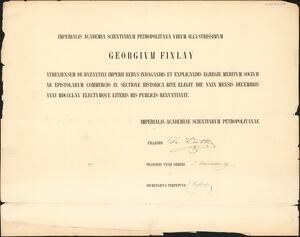 Letter of George Finlay to the Secretary of Hon. Membership of St. Petersburg Imperial Academy (23 June 1866) reply of the Secretary (24 August 1866).)