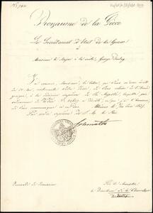 Notice of award of Croix d'Or for services rendered to Greece 'en votre qualité de Philhellène' by the King (Athens 3/15 June 1837) (in French).