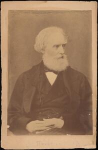 Portrait photograph pasted on card of a seated older George Finlay, with interlaced hands and looking off camera. Written in pencil at the bottom in Greek is, 'Πόνσο', and on the back 'George Finlay'