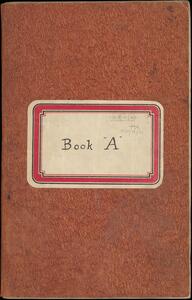 Rust mottle boards, handwritten, notebook, paginated pp. 1-122; 1-62, now labelled 'Book A', bound. Includes later typewritten contents pasted into front cover.