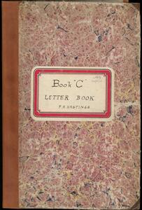 Red mottle boards, brown calf spine badly cracked, George Finlay's bookplate inside front cover, labelled on spine by George Finlay 'FAH's letters MSS', later labelled 'Book C. Letter Book. F. A. Hastings', unpaginated, handwritten letters pasted or bound in, bound.