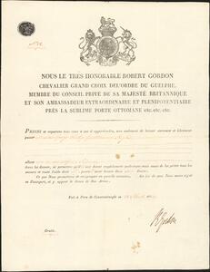 For Smyrna-to M. Georges Finlay gentilhomme Anglais avec un domestique from Robert Gordon, British Ambassador at the Sublime Porte Ottomane (28 August 1829).