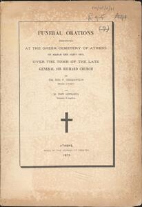 Funeral Orations pronounced at the Greek cemetery of Athens on 15/27 March 1873, over the tomb of the late General Sir Richard Church by the Hon. P. Chalkiopoulos, Minister of Justice, and Mr John Gennadius, Secretary of the Legation. Athens, Press of the Journal of Debates, 1873.