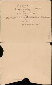 (in envelope) Diploma to George Finlay at Athens as Ehrenmitglieder der Gesellschaft für vaterländische Alterthümer in Zürich.
