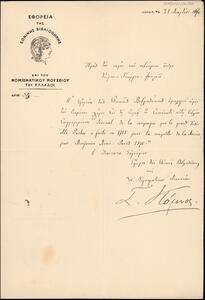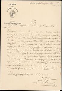 Letter from the Ephor of the National Library and the Numismatic Museum of Greece thanking George Finlay for copy of B. Brue's journal on the campaign of Ali Pacha (Athens 21 March 1870) (in Greek).