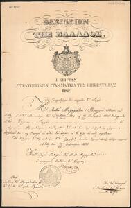 Notice of award of Silver Cross for military service during the War of Revolution (Athens 14/26 February 1836) (in Greek).