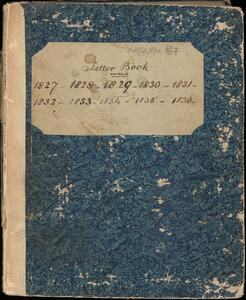 Blue mottle board, white paper spine (cracked), pp. 1-248+5 letters loose, handwritten, bound. Letters sent by George Finlay 3 January 1827-30 December 1836, varying from bare note of dispatch to complete draft of letter sent [only drafts are noted here]. With 1 newspaper clipping of an advertisement for a book.