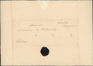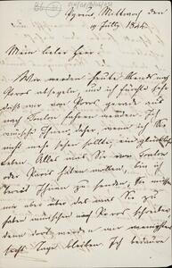 A. Miaoulis to George Finlay. Piraeus, 19 July 1844. Sends good wishes to George Finlay in case he does not see him; is unexpectedly sailing this evening for Poros and thence to Toulon. Will execute any commissions for George Finlay if he writes at once to Poros. Regrets leaving Greece at this point and asks George Finlay to send him news (in German, Gothic script).