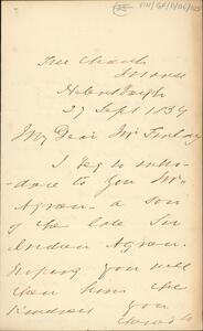 George Anderson to George Finlay. Free Church House, Helensburgh, 27 September 1839. Letter introducing Mr. Agnew. Appreciation of George Finlay's work.