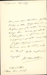 Marochetti to George Finlay. Vaux, Seine-et-Oise, 22 April 1843. Pleasure of their visit (in French).