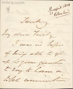 Alexander Cochrane, House of Commons, to George Finlay. 23 May 1843. Has given notice of motion on question of Greece in House of Commons; would welcome any further information from George Finlay.