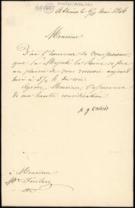 A. J. Kriezis to George Finlay. Athens, 6/18 May 1846. Invitation to meet Queen (in French).