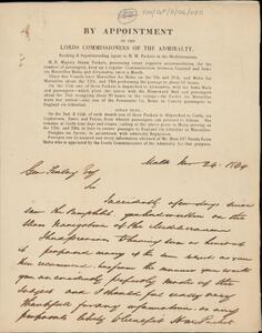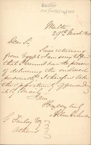 G. Muir to George Finlay. Malta, 24 November 1849. Acknowledges George Finlay's pamphlet on steam navigation in Mediterranean.