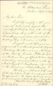 N. Hill to George Finlay. 4 St. Martin's Place, London, 2 September 1851. Will forward recent Transactions and Proceedings of the [Royal] Society [of Literature]. Regrets George Finlay's absence from recent meetings.