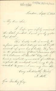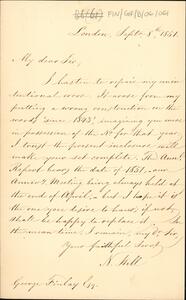 N. Hill to George Finlay. London, 8 September 1851. re Annual Reports of the Society requested by George Finlay.